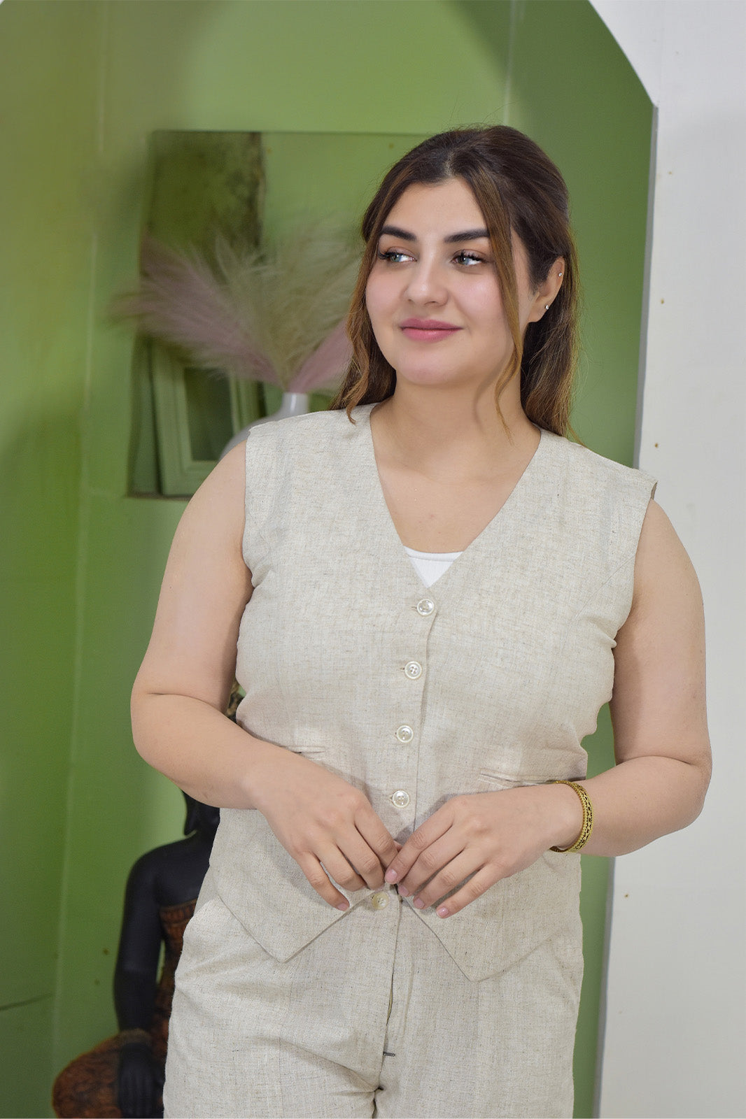 Add a touch of sophistication to your wardrobe with this Women's Cotton Linen Waistcoat designed for both style and comfort. Made from a breathable cotton-linen blend, it offers a lightweight feel perfect for layering. The tailored fit, with a button-down front and clean lines, creates a sleek, polished silhouette. Ideal for pairing with dresses, kurta sets, or shirts, this waistcoat enhances any outfit with a refined look. Perfect for casual outings, work, or evening gatherings, it combines timeless style with everyday comfort.